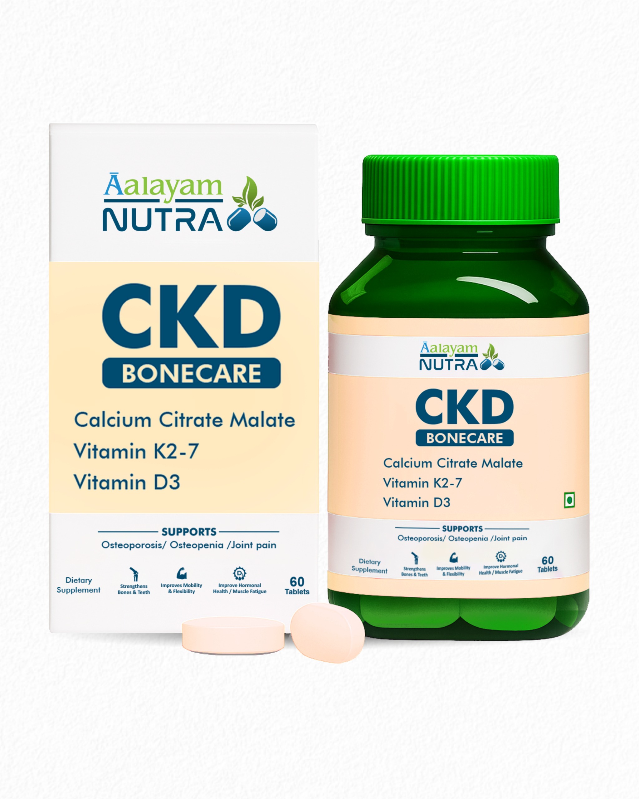 Aalayam CKD Bone Care is a thoughtfully formulated dietary supplement designed to support bone strength, joint comfort, and everyday mobility—especially for women and older adults. As the body’s natural calcium levels decline with age and hormonal changes, Aalayam CKD – Bone Care provides essential nutrients that help maintain bone density and support smoother movement. Its carefully balanced combination of Calcium Citrate Malate, Vitamin K2-7, and Vitamin D3 helps support bones and joints so you can continue your daily activities with confidence and ease.