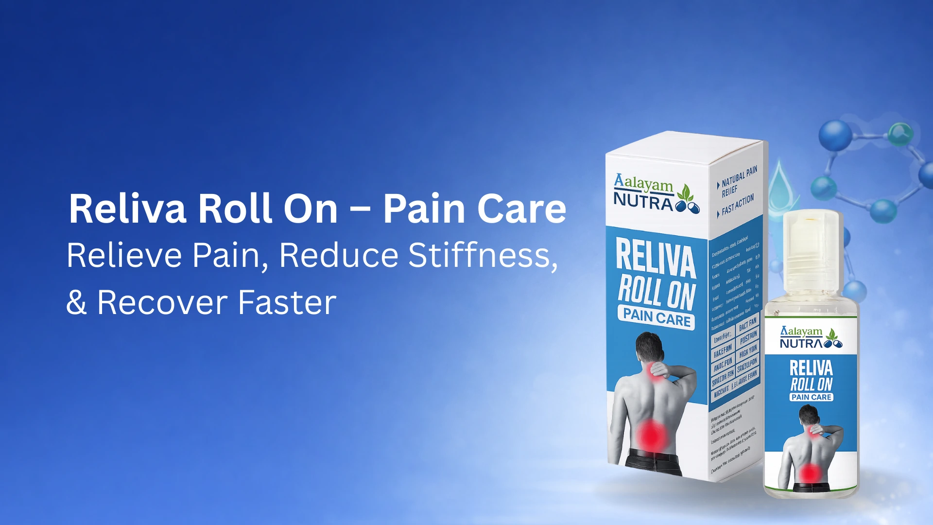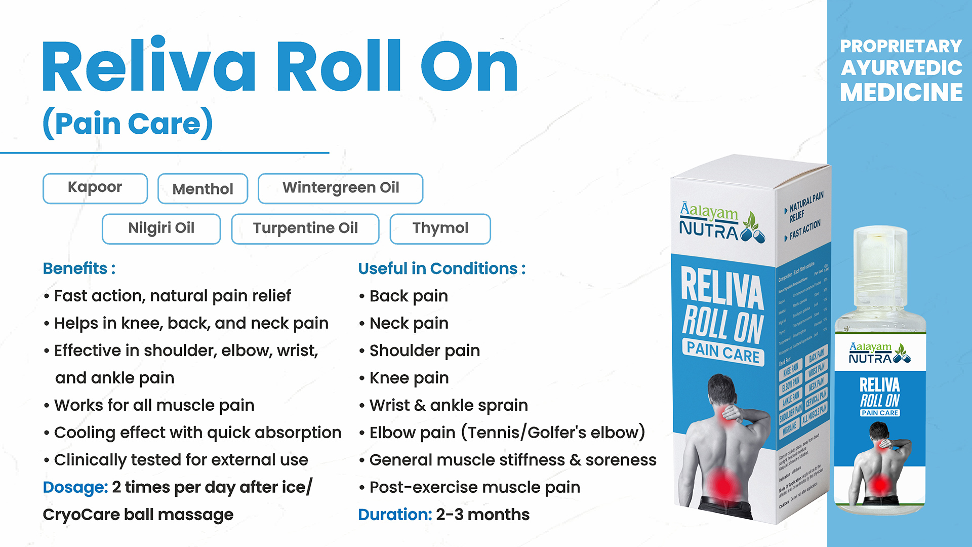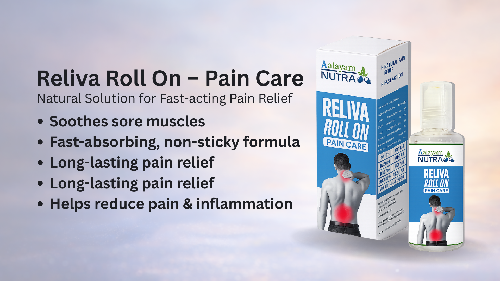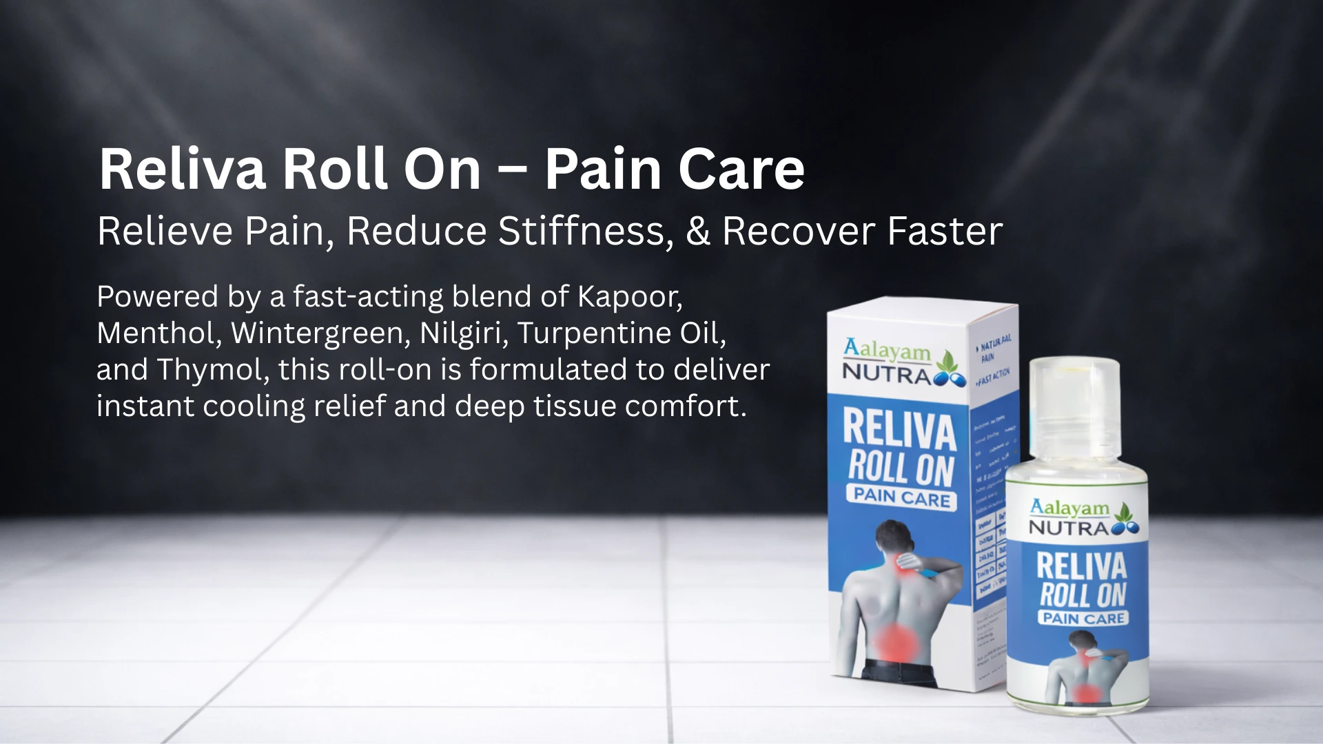 Did you know that sudden sprains, persistent muscle stiffness, and recurring joint aches are often triggered by stress, overuse, or poor blood circulation in the affected area? Aalayam Nutra Reliva Roll On delivers fast-acting, natural relief by combining powerful herbal ingredients that soothe inflammation, relax tight muscles, and restore mobility. With its quick-absorption roll-on action, it helps your body recover faster so you can move comfortably and stay active throughout the day.