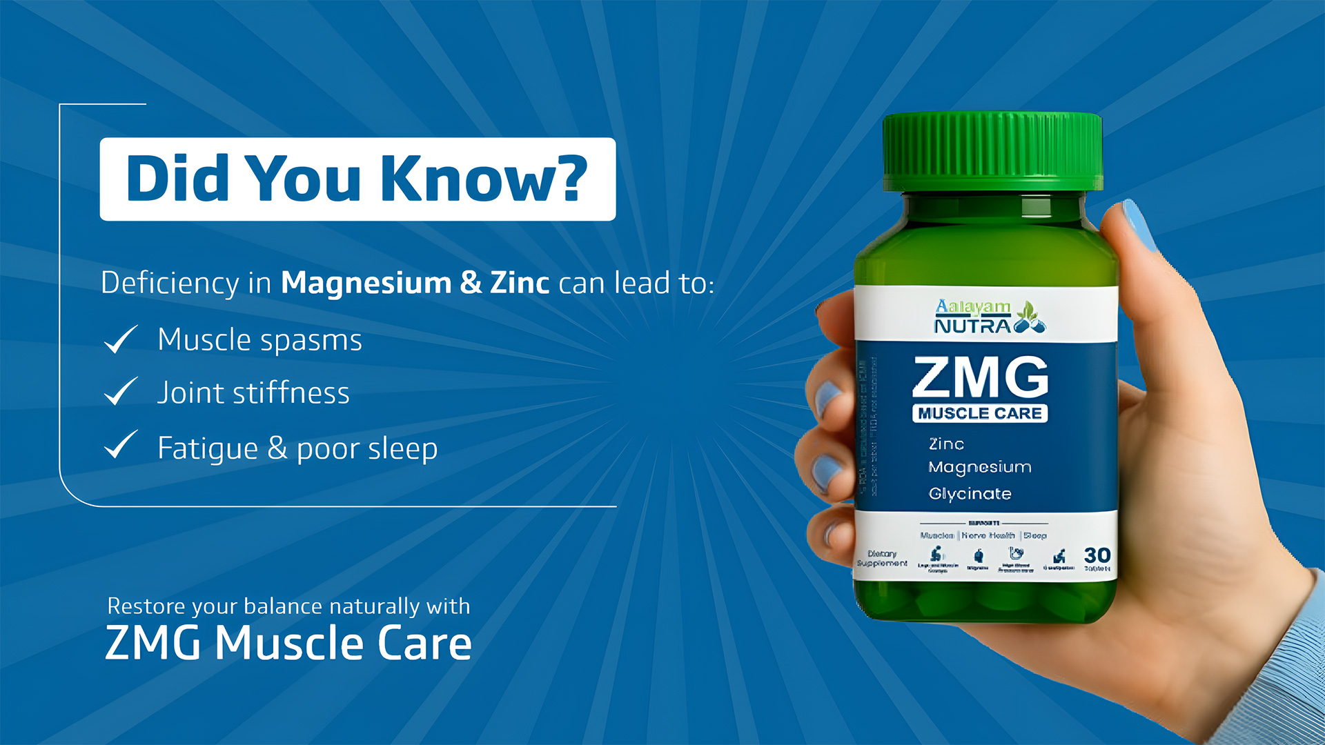 Did you know that nagging muscle spasms, persistent joint stiffness, and constant fatigue are often signs that your body is craving essential minerals? Aalayam Nutra ZMG Muscle Care is your natural solution to bridge this nutritional gap. By replenishing vital levels of Magnesium and Zinc, this formula tackles the root causes of poor sleep and physical discomfort, helping you restore your body’s internal balance so you can move freely and rest deeply once again.